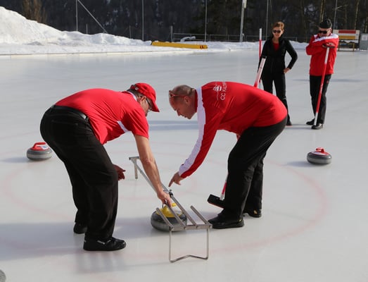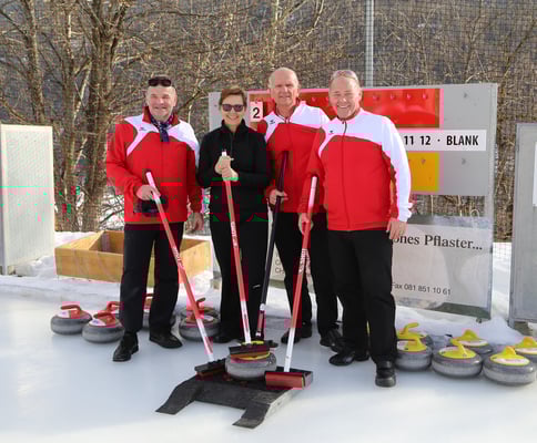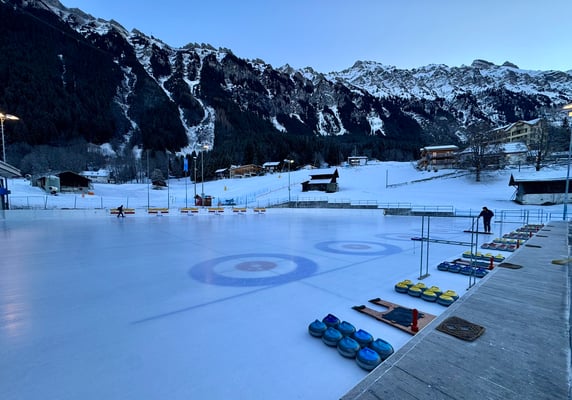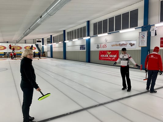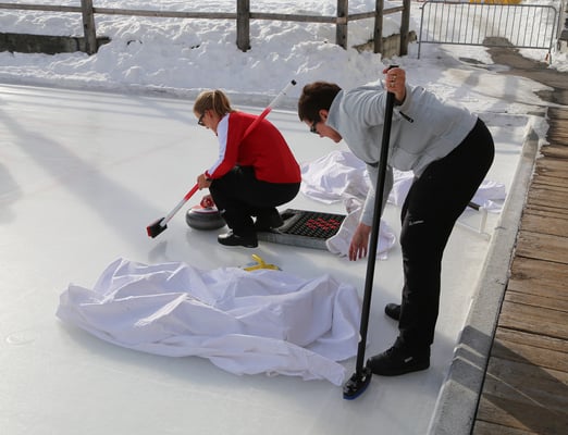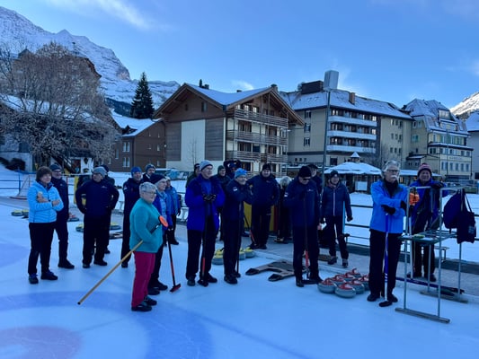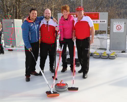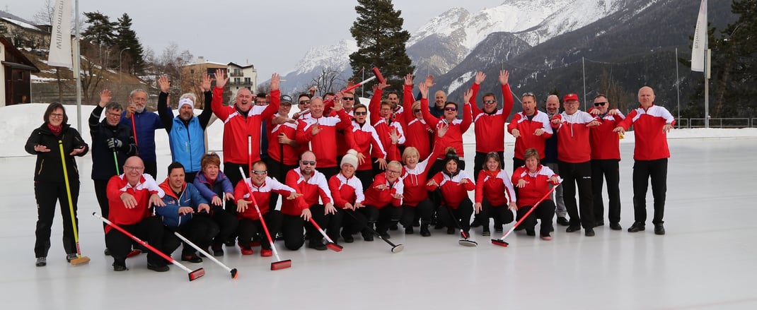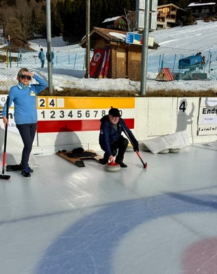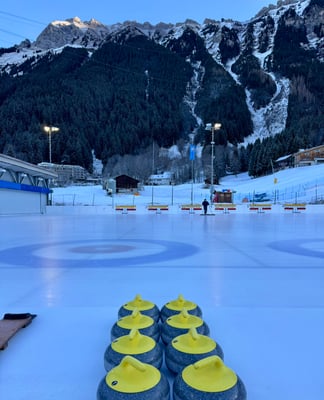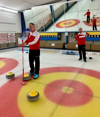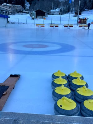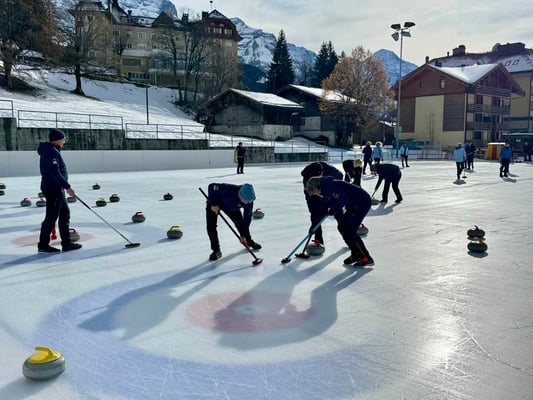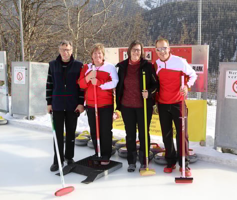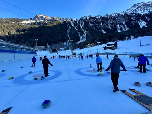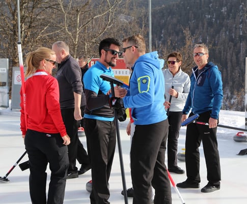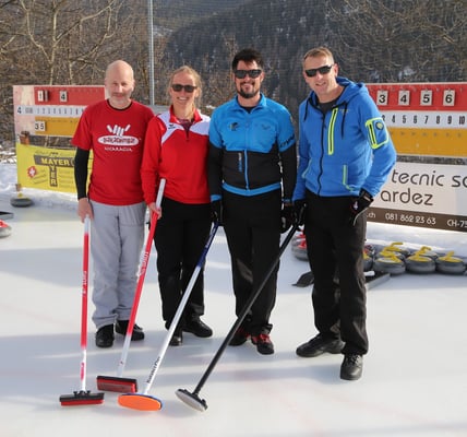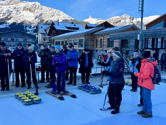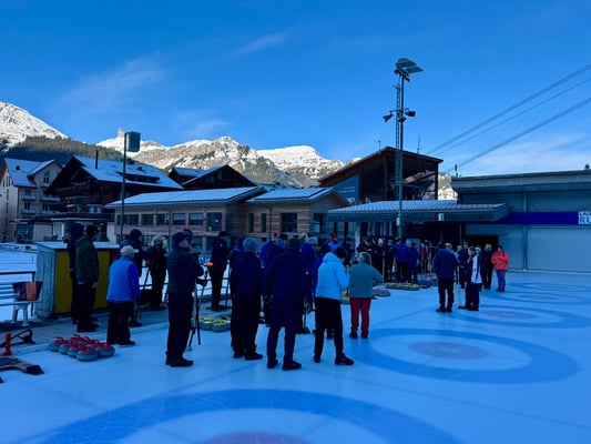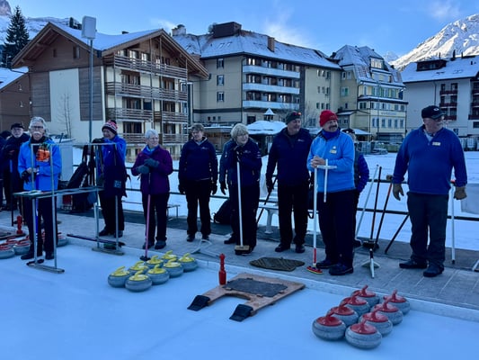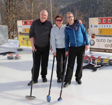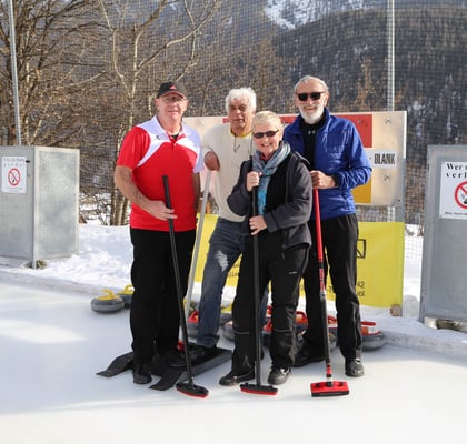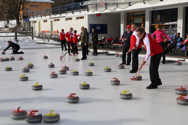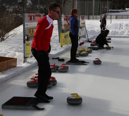 Am Samstag hiess es dann „Allegra Scuol“. In der Sportanlage Trü mit Natur- und Kunsteisbahn wurden wir von einigen Mitgliedern des CC Scuol herzlich begrüsst und in die Besonderheiten des Open-Airs Curling eingeführt. Was bedeutet Kontereis? Warum kommen plötzlich weisse Decken zum Einsatz? Wie schnell muss der Stein abgespielt werden? Wann muss oder darf man den Stein wischen, auch wenn er zu kurz erscheint? Alle diese Fragen wurden von den Curlerinnen und Curlern aus Scuol kompetent beantwortet und vordemonstriert.