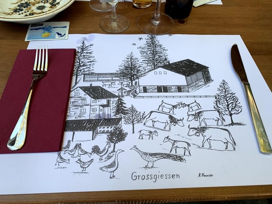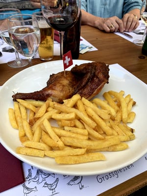Im gemütlichen Garten auf dem Hof wurden wir danach mit einem sehr feinen Güggeli und Beilage nach
